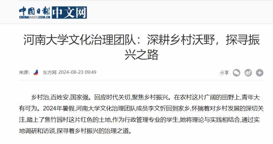 学子李文忻暑期深入河南省焦竹园村进行调研的事迹被《中国日报》报道,此次调研不仅体现了鱼虾蟹骰子