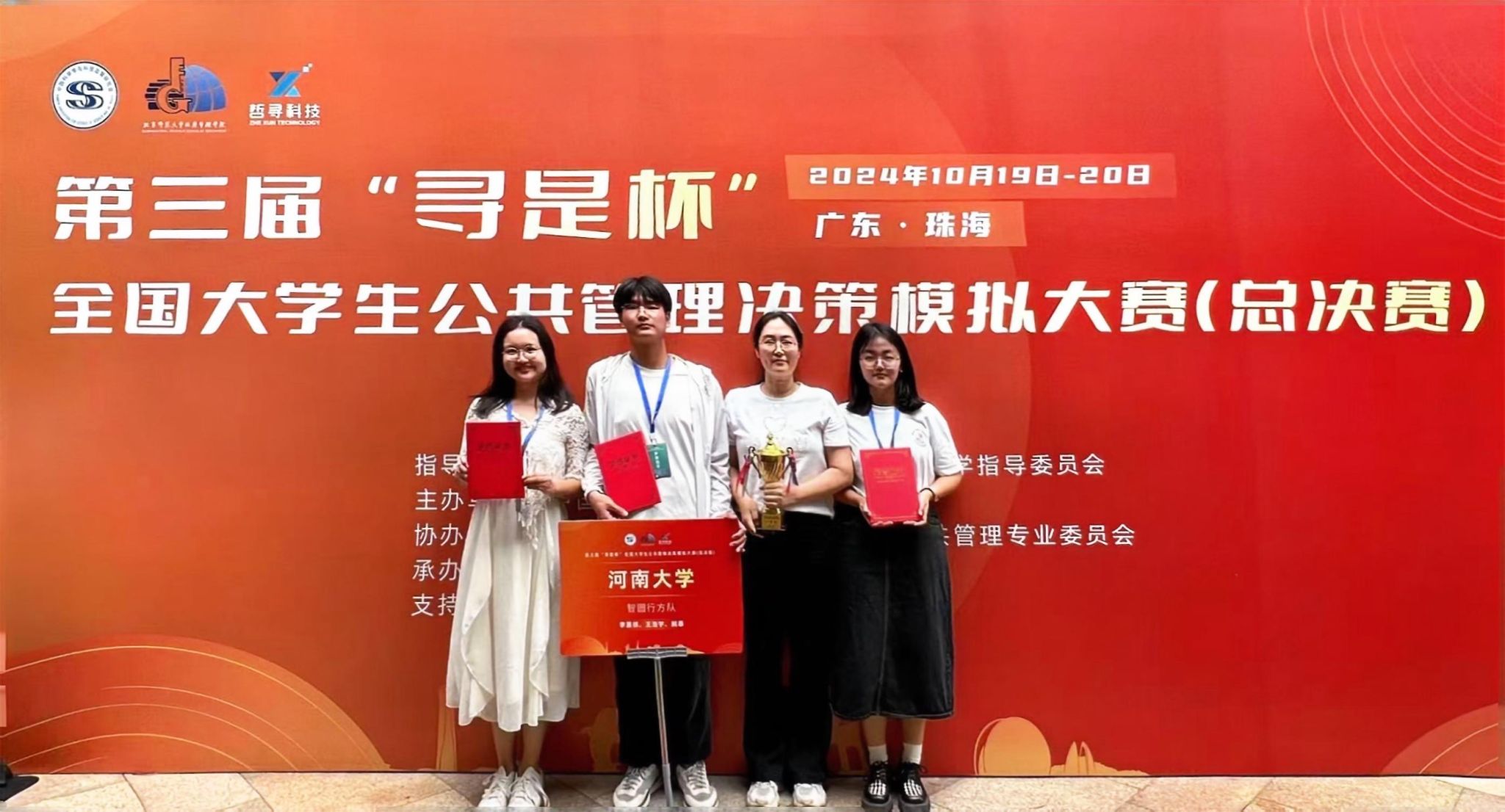 “寻是杯”全国大学生公共管理决策模拟大赛是公共管理学科领域面向本科生开设的代表性的全国赛事。比赛分为公共管理方案设计、公共管理决策演练沙盘对抗和团队现场答辩三个阶段,以赛促能,充分考验参赛学生的实践能力、创新能力和就业能力。本次比赛共有来自全国近300所高校的队伍参与7个赛区选拔赛的晋级角逐,河南大学代表队以华中赛区一等奖晋级全国总决赛。