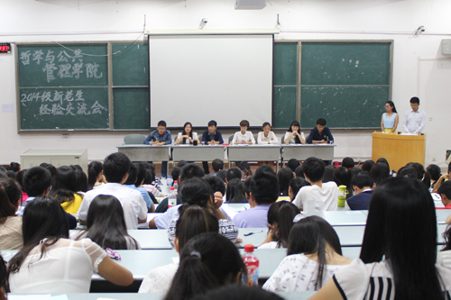 2014级新老生经验交流会在金明校区综合教学楼2406教室顺利举行。院团委副书记姚琛、学生会主席韦元智、秘书长兼辩论队队长林歌、副主席吴怡秋、2013级年级长孟辰、学霸宋金明、青年学社会长吴海良出席会议。
