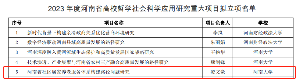 凌文豪老师申报的题为《河南省社区居家养老服务体系构建路径问题研究》的项目获批立项。