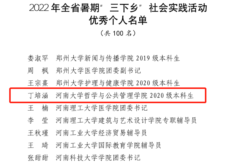 暑假“三下乡”社会实践活动,并作为该团队的副队长,在“三下乡”工作中表现突出,被共青团河南省委评选为2022年全省暑期“三下乡”社会实践活动优秀个人。