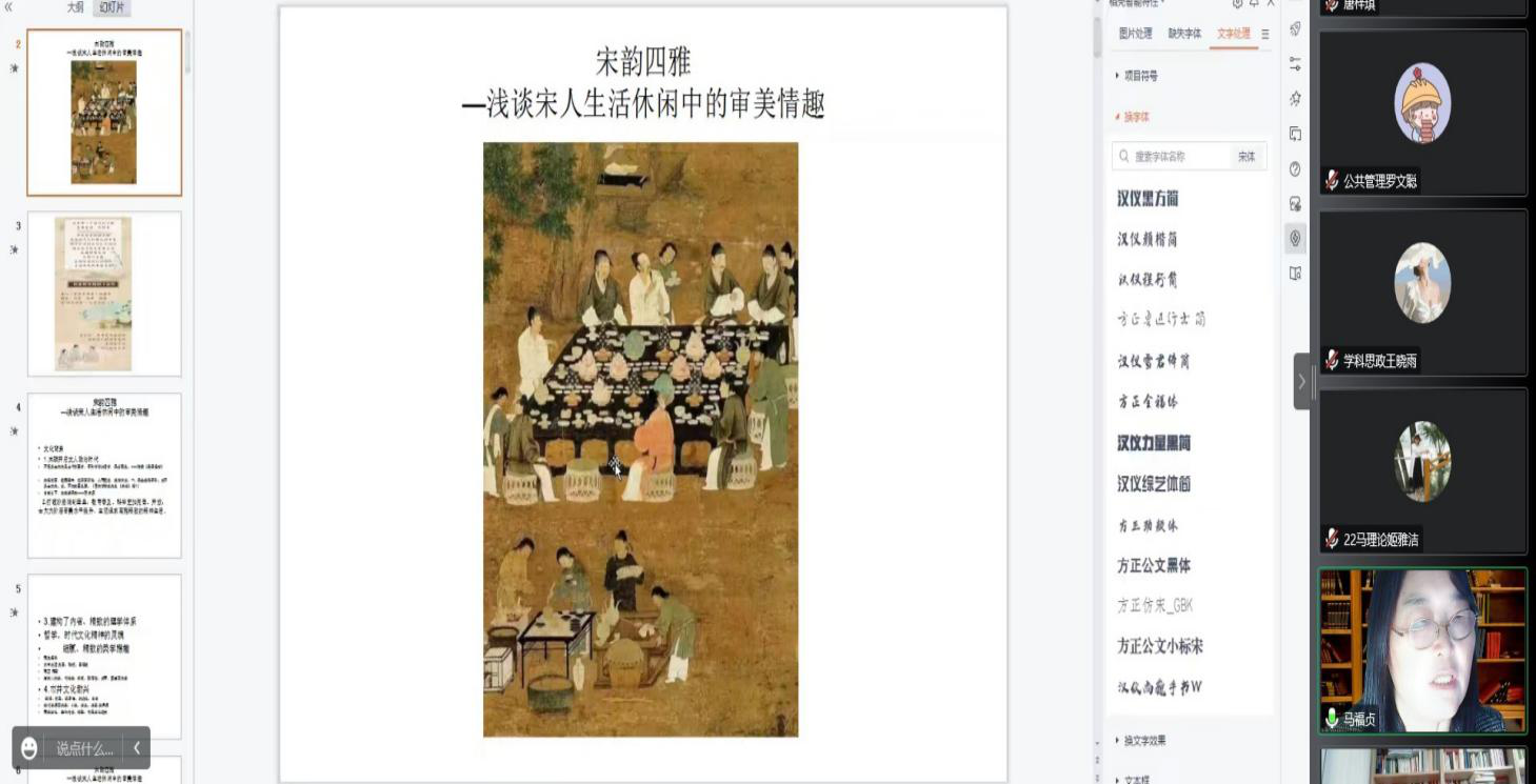 马福贞副教授在线作了题为《宋韵四雅——浅谈宋人生活休闲中的审美情趣》的报告,讲座由杨红玉副教授主持,鱼虾蟹骰子