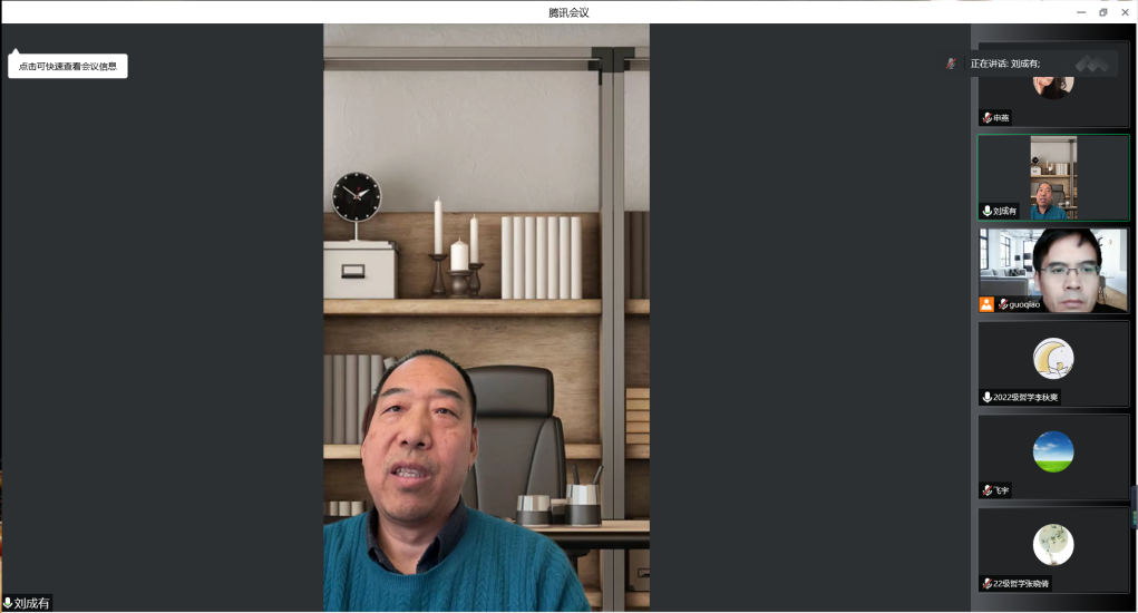 院长刘成有教授在线作了题为《中国哲学的多元通和特征》的报告,报告会由鱼虾蟹骰子