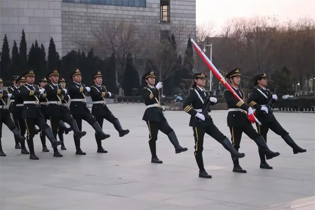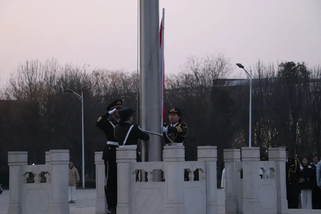 红日初升,其道大光。在国旗护卫队铿锵有力的正步声中,五星红旗被护送至升旗台。嘹亮的国歌奏响,鲜红的国旗冉冉升起,全体师生面向国旗庄严肃立,行注目礼。