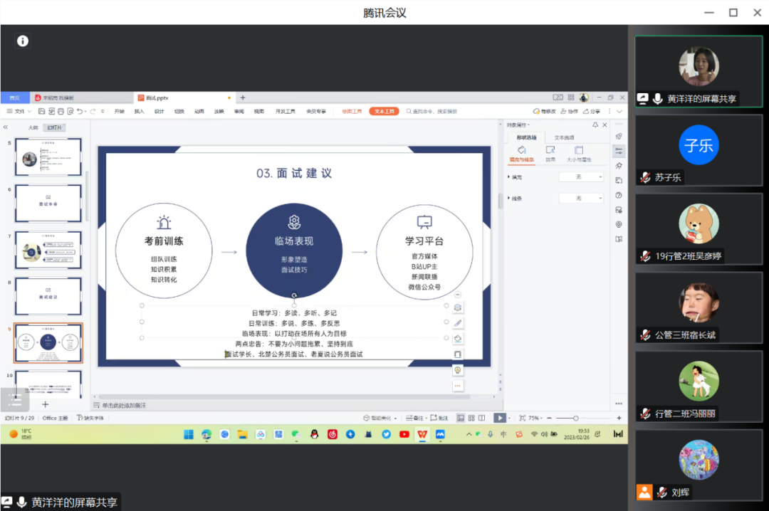 会议伊始,黄洋洋作题为《公考面试那些事——体验、体会与建议》的分享,分面试体验、体会和建议三部分与同学们展开交流。面试体验部分,他结合自己丰富的面试经历,向大家介绍面试形式和题目类型,增进同学们对公考面试整体环节的了解。对于面试过程,他谈到面试中可能会有情绪紧张、身体状况不佳等问题,会干扰面试的总体状态,建议大家考前“多读、多听、多记、多说、多练、多反思”,合理利用多方资源,广泛收集信息,夯实基础,树立自信。同时要注重形象管理,保持良好的精神状态,从容应对面试问题。