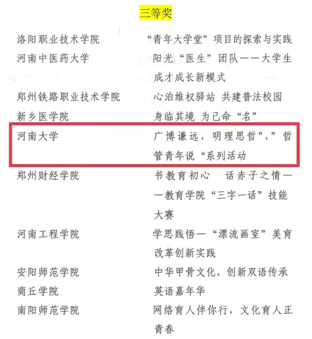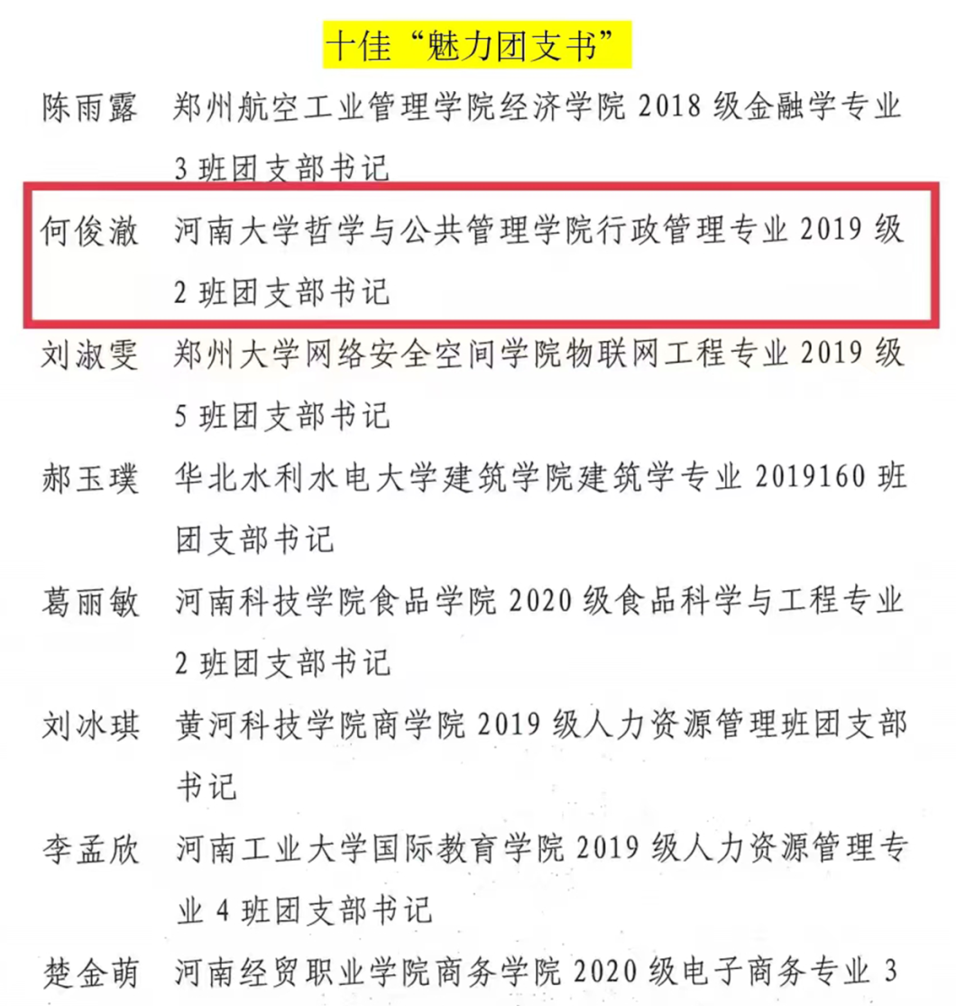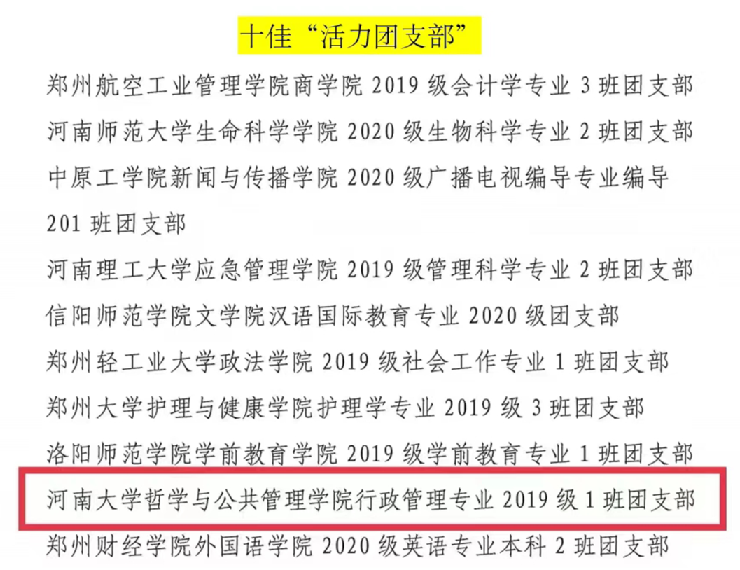 “承前启后中国年,听说读写提能力”新年主题系列活动和“广博谦远,明理思哲”“哲管青年说”系列活动荣获共青团工作项目大赛一、三等奖,行政管理专业2019级1班团支部获十佳“活力团支部”奖项,行政管理专业2019级2班何俊澈获十佳“魅力团支书”称号。