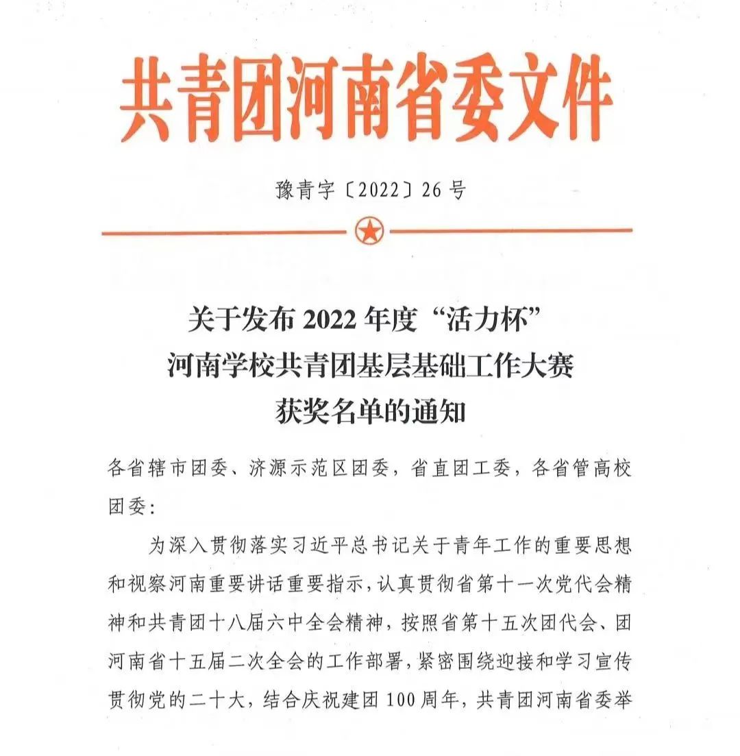 共青团工作的肯定和认可,进一步鼓舞全院师生贯彻落实习近平总书记关于青年工作重要思想和视察河南重要讲话重要指示,继续跟党走、奋进新征程,持续巩固共青团的基础性战略地位,争取以优异的成绩迎接党的二十大胜利召开。