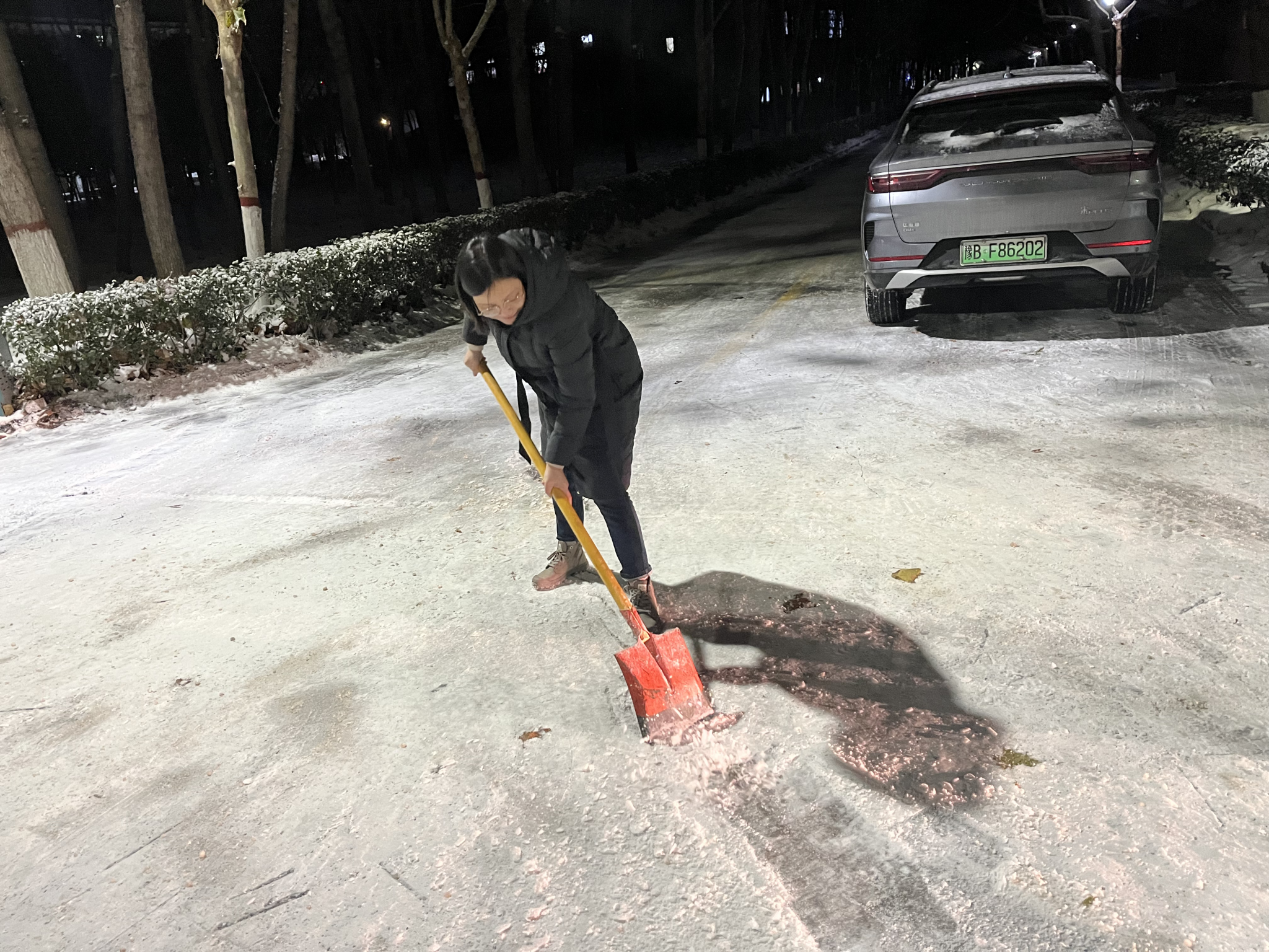 党委清扫积雪号召,从早上到晚上,多次对学楼和南苑餐厅路面上的积雪进行破冰清扫。