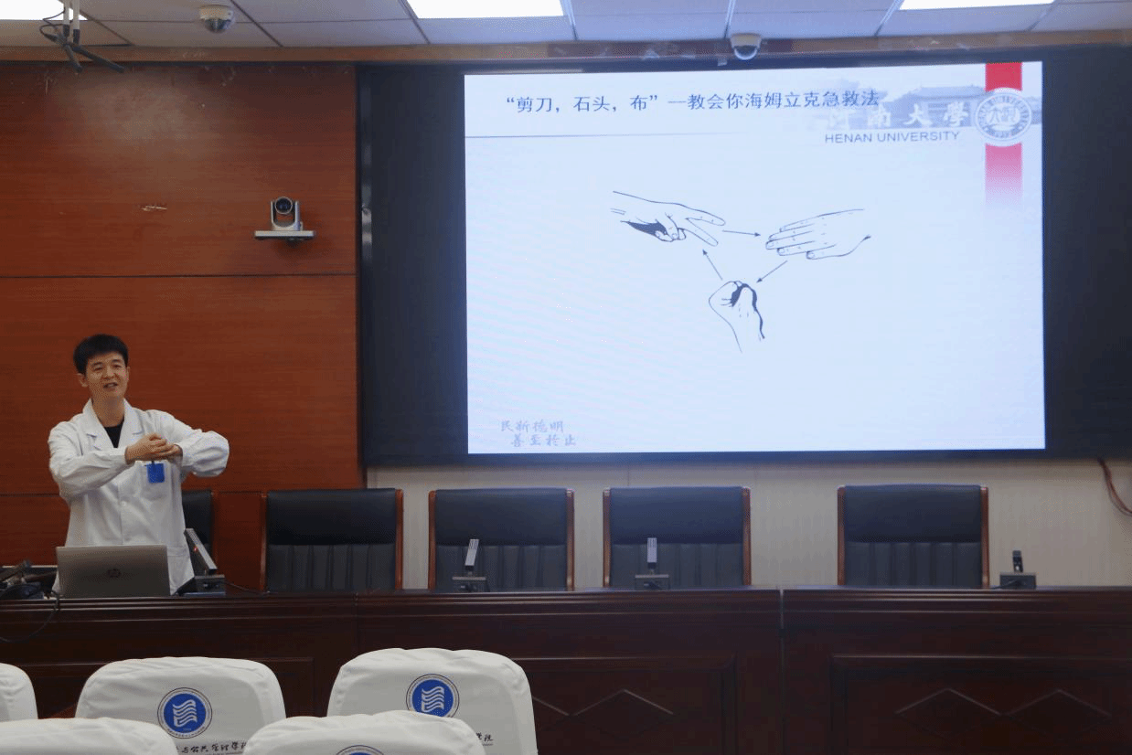 活动现场,樊航医师以一段生动有趣的短片引入,向大家列举了生活中常见的气道梗阻情形,并进一步讲解演示了解除办法——“海姆立克”。现场同学积极配合樊航医师进行了动作模拟演练。同学们在轻松有趣的氛围中提高了对气道梗阻的辨识与急救能力。