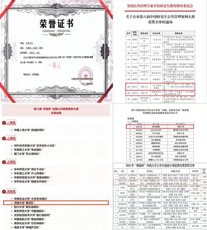 不断强化和优化社会实践教学,以大赛为抓手,推进“以赛促教、以赛促学、以赛提能、以赛促用”,劳动与社会保障系李晓玉教授、行政管理系元帅博士指导的由行政管理专业李董祺、王浩宇,劳动与社会保障专业解菲三名同学组成的参赛团队,在第三届“寻是杯”全国大学生公共管理决策模拟大赛(华中赛区)中斩获一等奖;行政管理系刘辉教授指导的“政青春-师出同门”团队的作品和社会工作系朱磊副教授指导的“三只小熊突然碰队”团队的作品在来自全国260所院校的2597支队伍中脱颖而出,荣获优秀奖;行政管理系李有学副教授、吴岚波副教授担任指导老师,行政管理专业韦梦梦、朱佳凝、龚滔、张向前,社会工作专业李菁如五位同学撰写的案例分析报告获得全国优胜奖,创造了我校学子在该赛事的最好成绩;由李晓玉教授指导,2022级行政管理专业陈宛玥等同学组成的阿闯面塑团队在第十四届全国大学生电子商务“创新、创意及创业”挑战赛中荣获河南赛区省级选拔赛特等奖;李晓玉教授指导的团队参赛项目《手艺·拾遗——让面塑搭上文创“快车”,做非遗传承的引潮者》荣获2024年“挑战杯”河南大学大学生创业计划竞赛一等奖。一系列奖项的获得不仅是对鱼虾蟹骰子