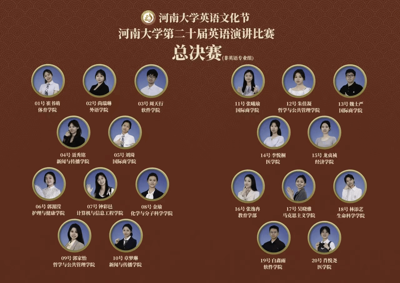 本届英语演讲比赛总决赛共20位选手,历时三个多月经层层选拔挺进总决赛,以“中国龙福泽天下”为主题,两位选手从不同角度深刻理解,生动诠释龙文化的内涵,用英语讲述中国故事,传递中国文化,彰显了鱼虾蟹骰子